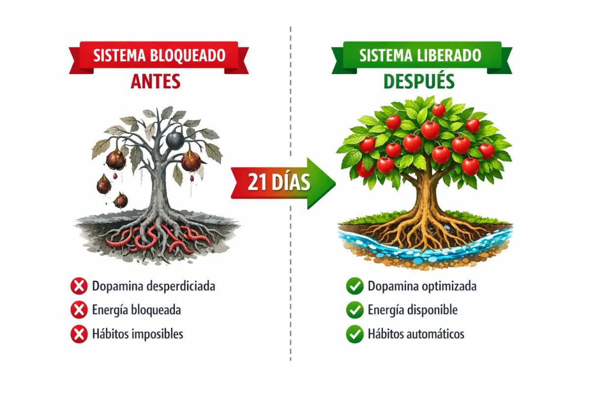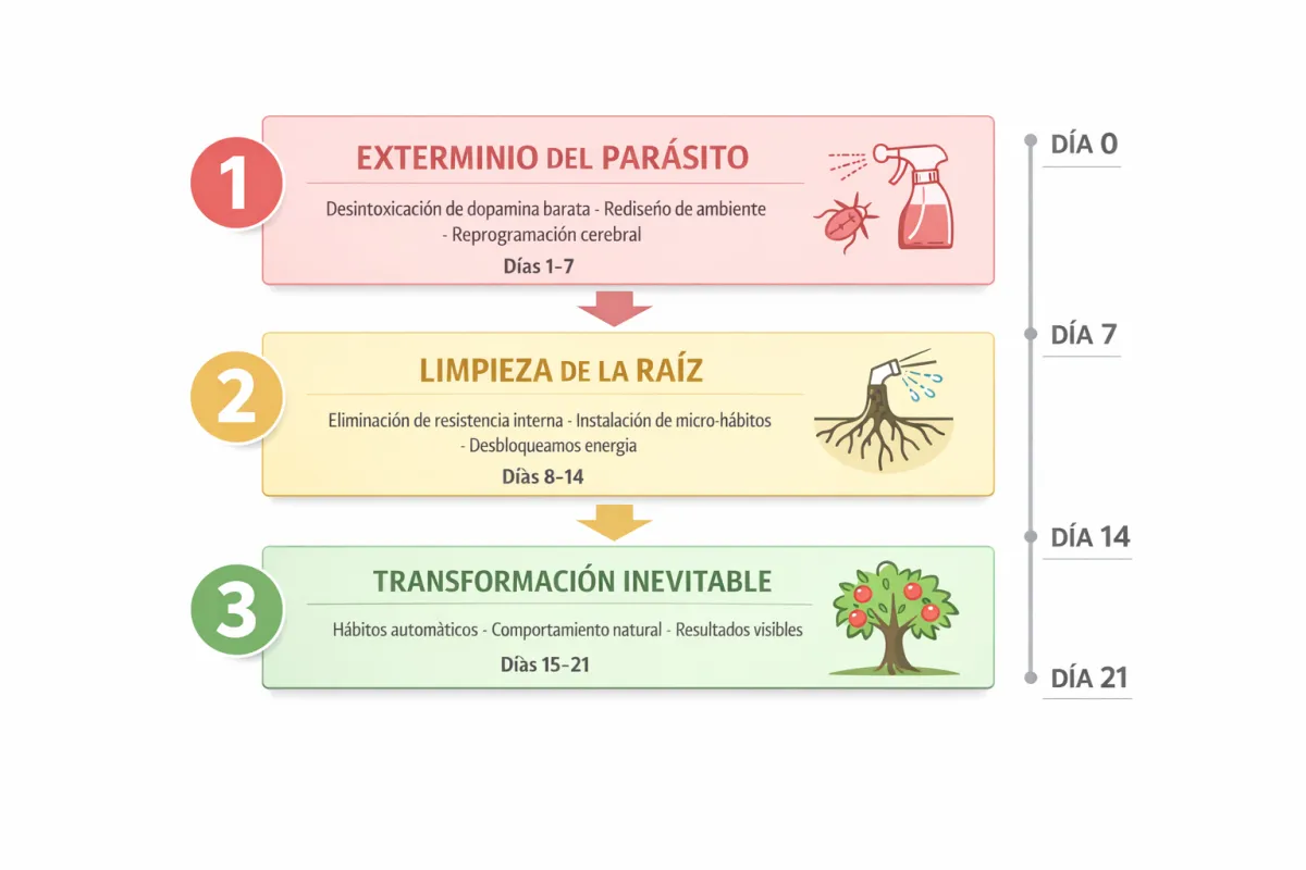 Eliminamos el sabotaje biológico que te hace abandonar. Esto significa "desintoxicar" tu cerebro de la dopamina barata, rediseñar tu ambiente para eliminar triggers, y reprogramar tu sistema de recompensa.